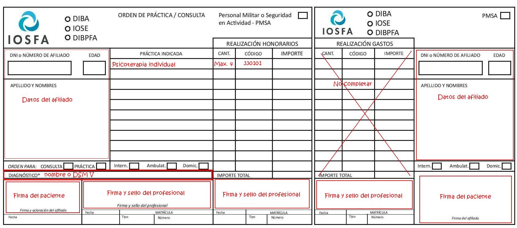 El profesional deberá completar la orden de práctica adjuntando resumen diagnóstico, la cual deberá llevar el afiliado a la delegación de IOSE para ser autorizada; la misma debe estar completa en todos sus campos. En las oficinas de IOSE sellan al dorso la orden con una leyenda «autorizado Colegio de Psicólogos»